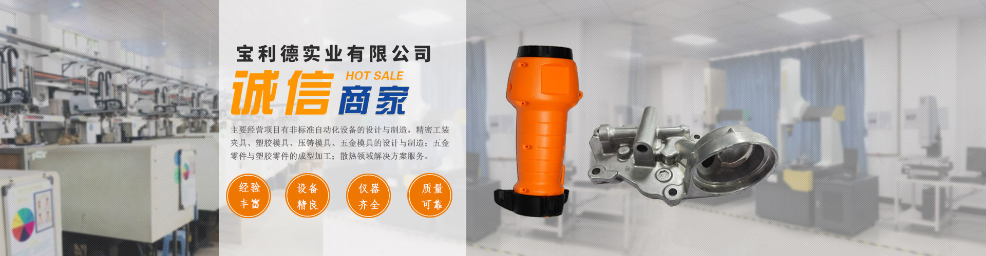 “东莞市宝利德实业有限公司”占地面积约为10000平方米,主要经营项目有非标自动化设备的设计与制造,精密工装夹具、治具、检具、五金模具、塑胶模具、压铸模具的设计与制造,五金零件与塑胶零件的成型加工。